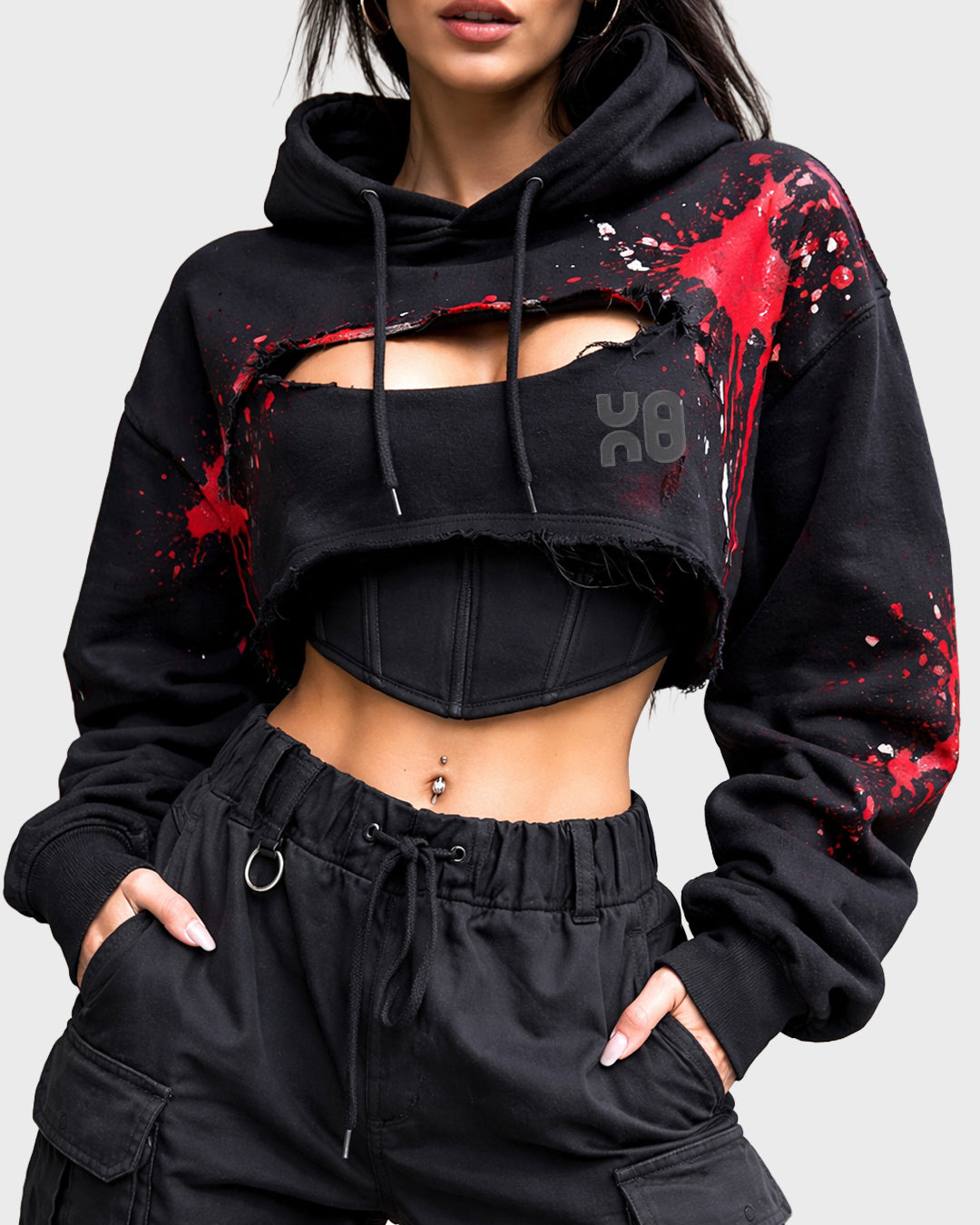 The cropped hoodie features asignature chest cut-out design with striking red paint-splatter graphics, giving the piece a rebellious streetwear aesthetic.